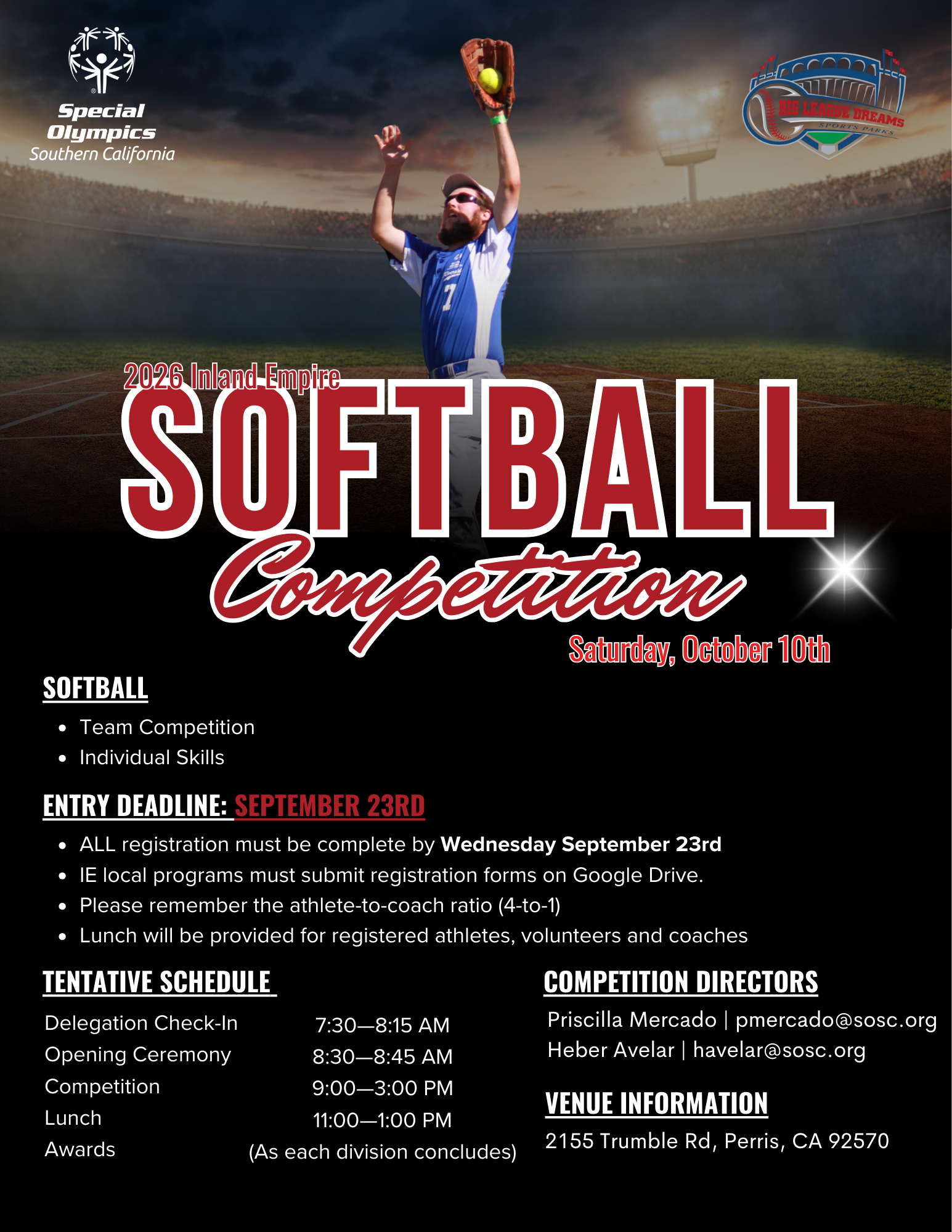 MAP LocationBig League Dreams Sports Complex2155 Trumble Rd, Perris, CA 92570 DateOct 10 2026 Time 7:30 am - 3:00 pm2026 Inland Empire Softball CompetitionSpecial Olympics athletes compete in softball.Volunteer Arrival Time | 6 a.m.Download Event FlyerShare this event+ Add to Google Calendar+ iCal / Outlook export Tags: Competition, Fall Season