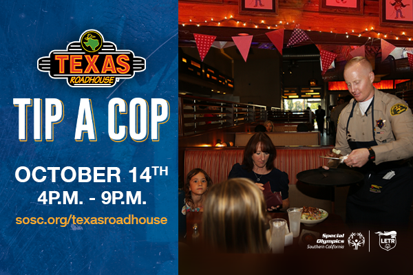 Join us on Tuesday, October 14 from 4–9 p.m. at one of 10 Texas Roadhouse locations across Southern California for a one-day-only Tip-A-Cop fundraiser! Local law enforcement officers will trade in their badges for aprons as they serve up smiles and raise funds for Special Olympics Southern California athletes. Simply mention SOSC to your server, and 10% of your bill will be donated, helping empower athletes with intellectual disabilities through sports, health, and community programs.